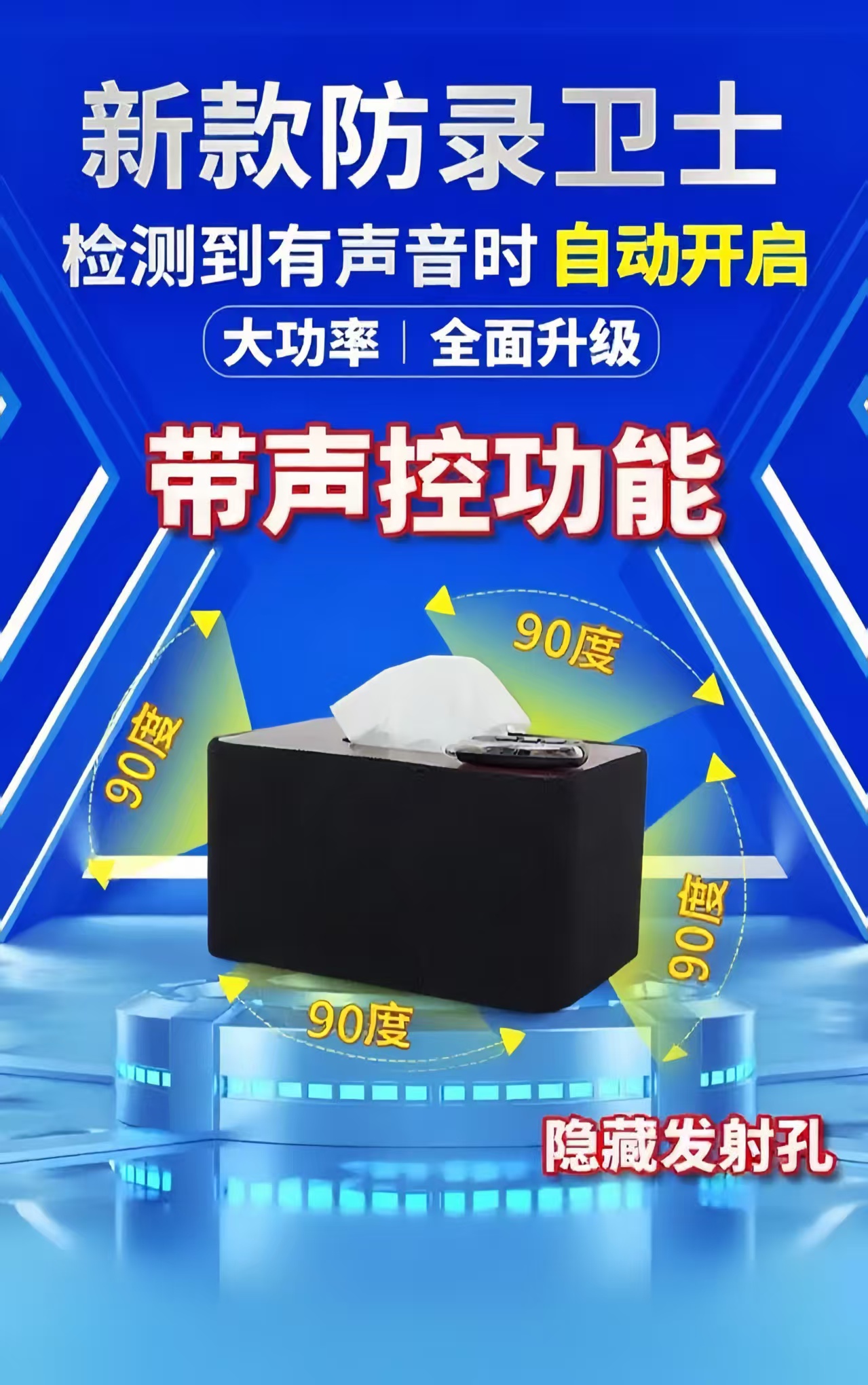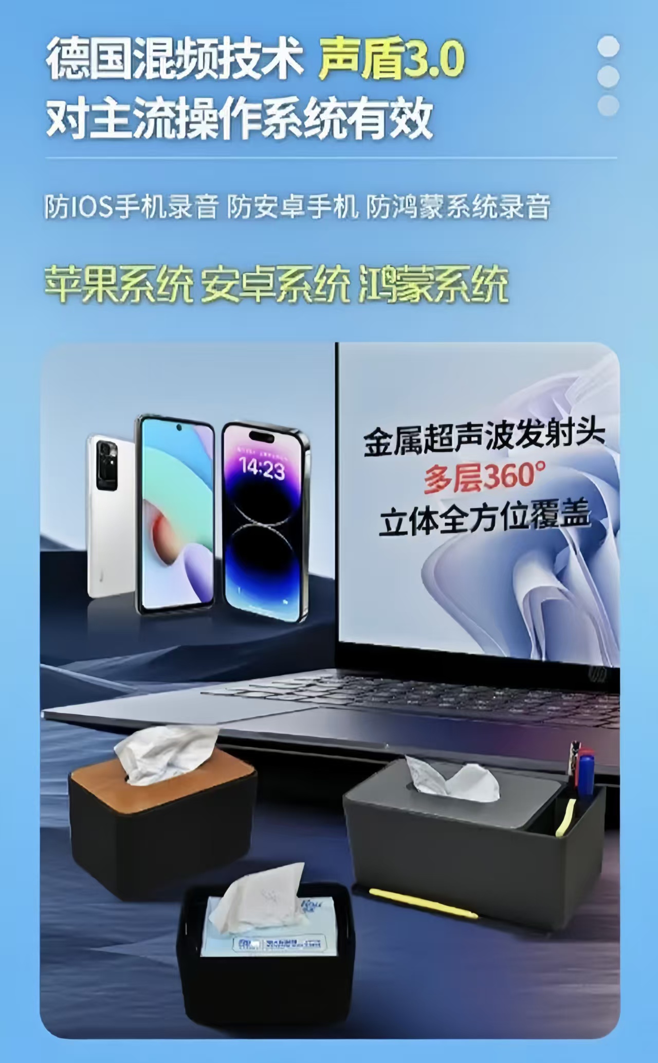 产品简介:这是一款仿纸巾盒录音屏蔽器,是以声波干扰型的高科技防护类产品,当不法分子采用录音设备(如手机、录音笔、录音机等)进行偷录时,防录音设备会产生随机性的超声波噪音信号,该信号能够对语音信号产生压制性干扰与覆盖,让录音回放无法分辨出语音信号,从而防护好语音信息的安全