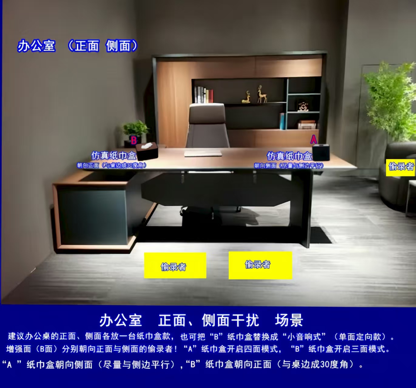 产品适用场景:办公室、保密会议室、信访中心、商务洽谈室、保密局、纪委、公检法司大厅接待等任何进行私密谈话的办公场所。