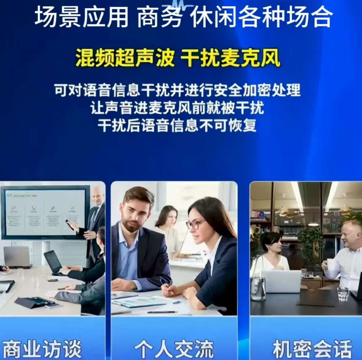 7、安全无感:采用超声波带噪声学干扰技术,人耳无察觉,无电磁辐射,安全健康有效阻断录音功能,对手机硬件功能不产生干扰或损伤,设备符合相关产品检测标准,对人体无害;