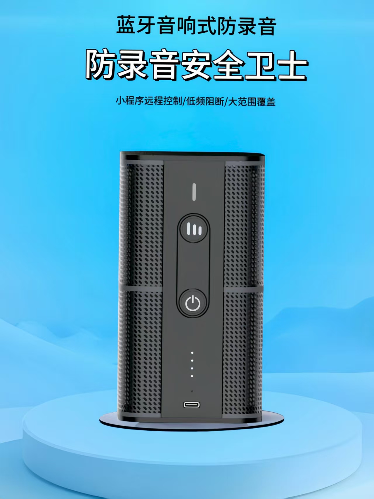 音箱伪装全方向录音屏蔽干扰器,体积小巧内置6000mAh大容量电池,超长续航使用,可在沟通洽谈等场景中能够灵活移动摆放使用,可放置在固定位置长时间插电使用。可在屏蔽录音的同时作为蓝牙播放音乐,隐秘性更强。可通过产品内附遥控器控制,更可通过微信小程序私密开启设备录音干扰/屏蔽。
