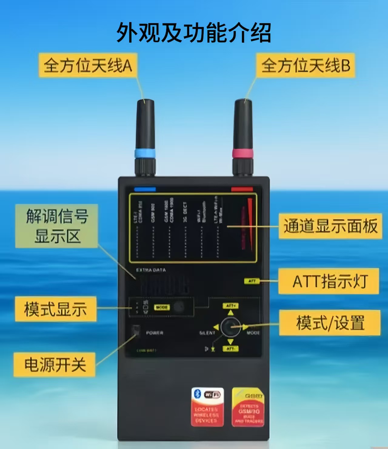 ●6个柱状图场强指示(每个10段),用于精确定位发射源