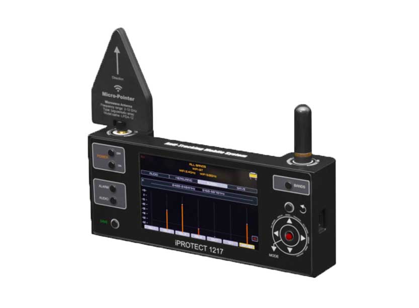 产品简介:1217与传统射频检测器相比,支持中远距离检测手机和无线信号,可高效地找出任何移动设备,如GPS跟踪器、手机、使用2G、3G、LTE协议的窃听装置、WiFi视频摄像头等。 设备检测频率覆盖全球手机信号标准,可检测GSM、CDMA、3G、4G/LTE和5G的所有现有频段,范围可达6GHz。并涵盖所有类型的无线信号,包括Wi-Fi 2.4GHz、蓝牙、Wi-Fi 5GHz、DECT、ISM434 MHz、ISM968 MHz和ISM915 MHz。