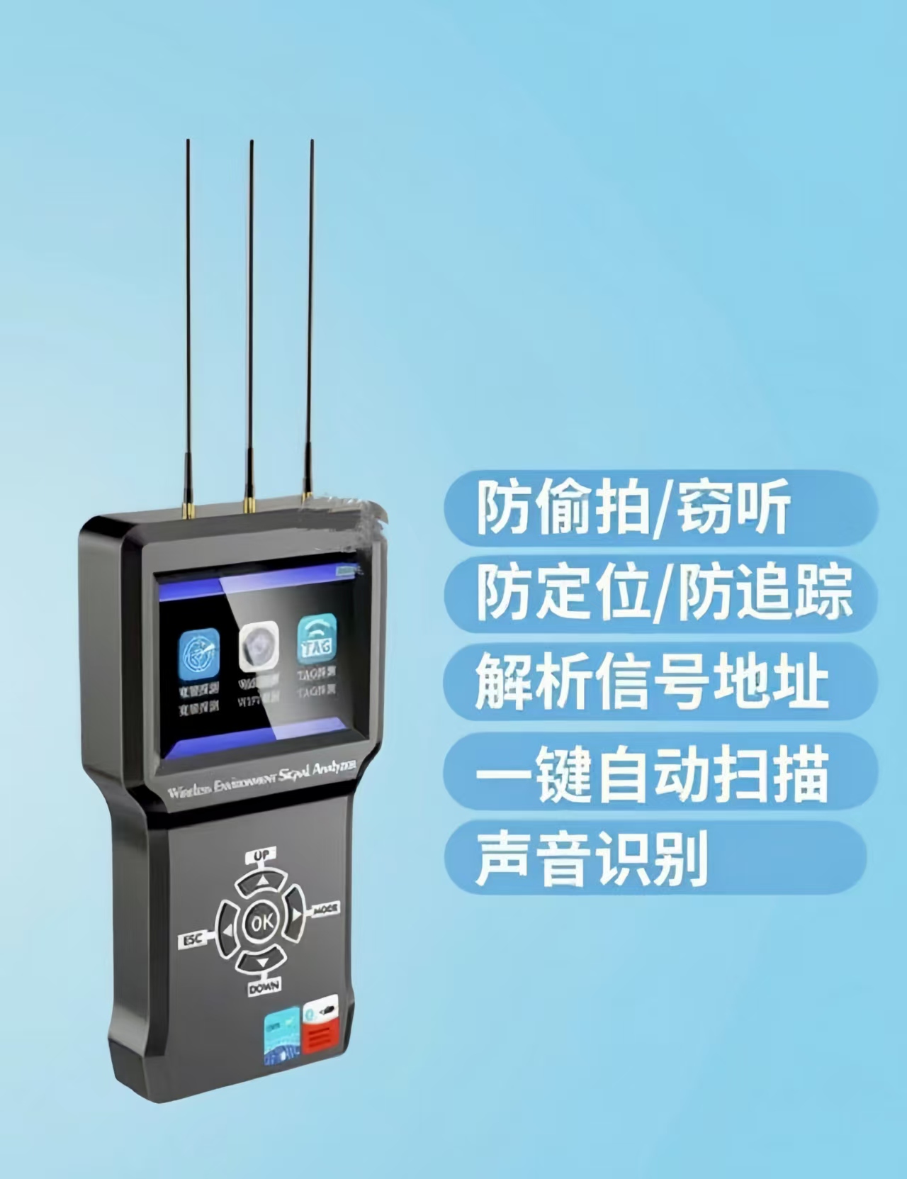 产品简介:单兵多功能无线窃听窃视信号探测器是一款突破性的安全设备,集宽频检测、智能扫描WiFi针孔镜头检测和纽扣TAG定位器检测三种功能于一体。这款探测器适用于各种需要加强安全防护的场景,如公共场所、贵重物品存储区、重要会议等,旨在为您的安全保驾护航。