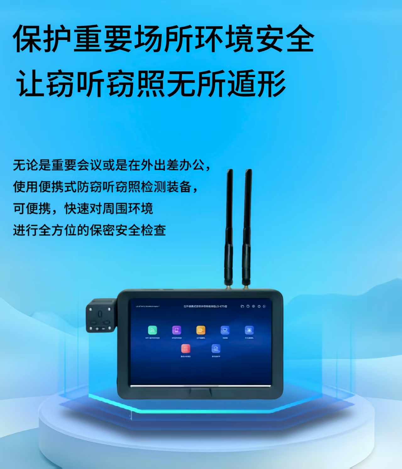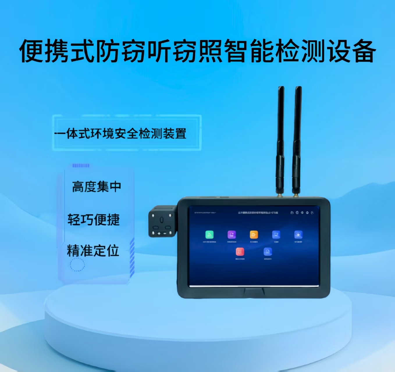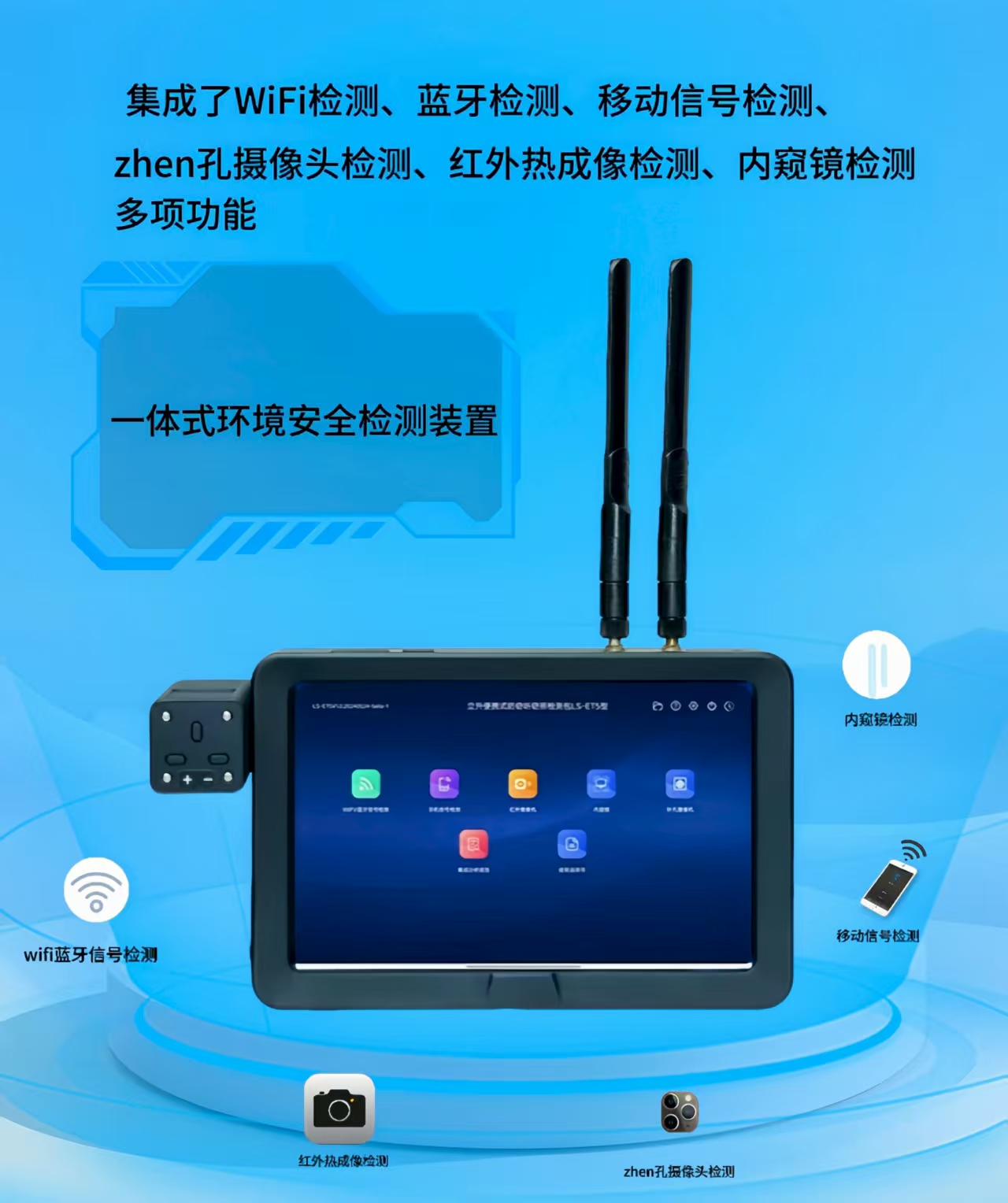产品简介:这款一体式安全检测装备专为重要场所打造,集成了WIFI/蓝牙、移动信号、针孔摄像头检测仪、红外热成像和内窥镜检测模组等多项功能。帮助操作者在重要场所中快速、精准地定位隐藏的窃听窃照设备,从而全面、有效地检查出存在的失泄密漏洞和安全隐患。