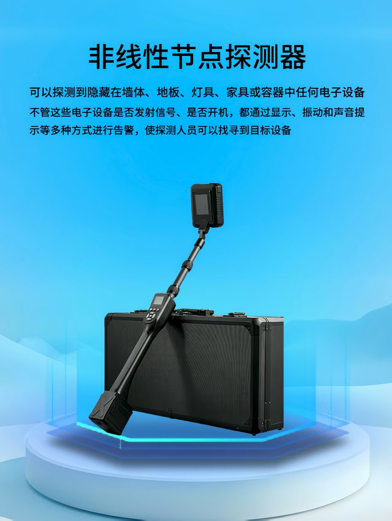 产品简介:非线性节点探测器,可以探测到隐藏在墙体、地板、天花板、灯具、家具或容器中的任何电子设备,不管这些电子设备是否在发射信号、是否开机,都通过显示、振动和声音提示