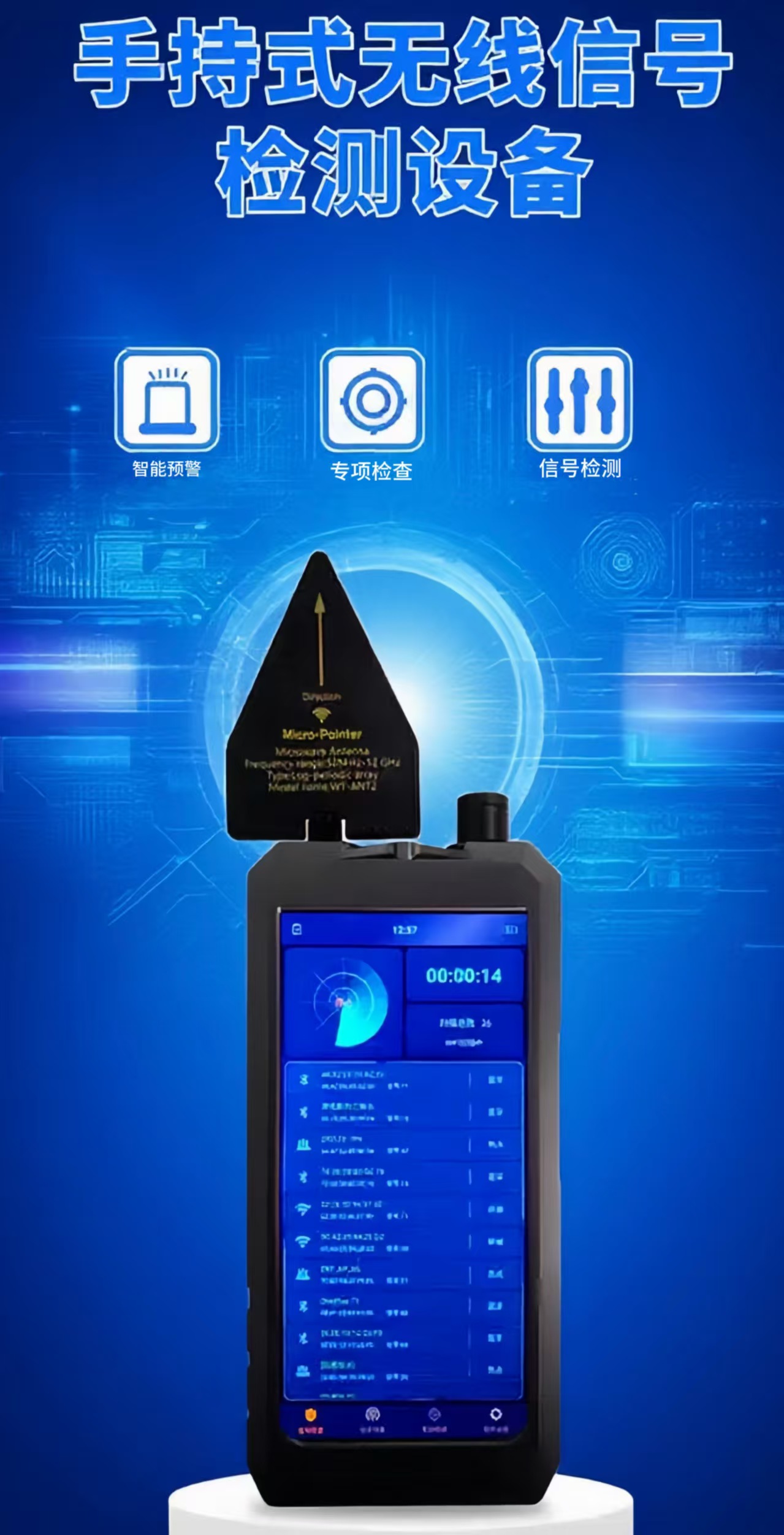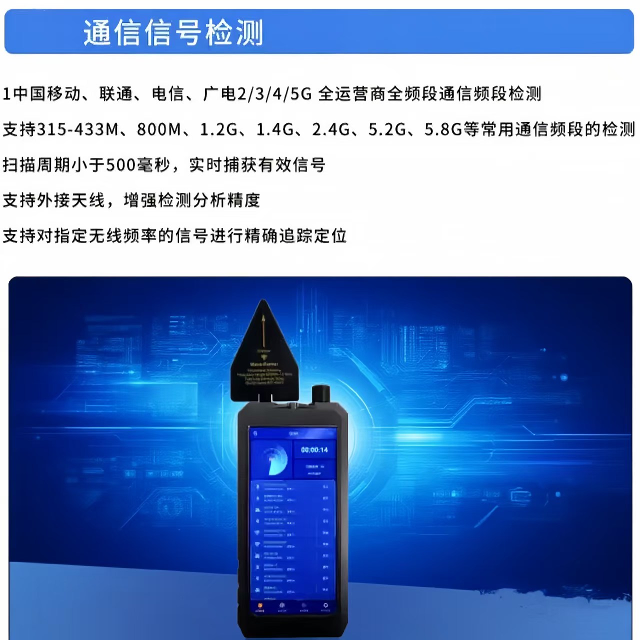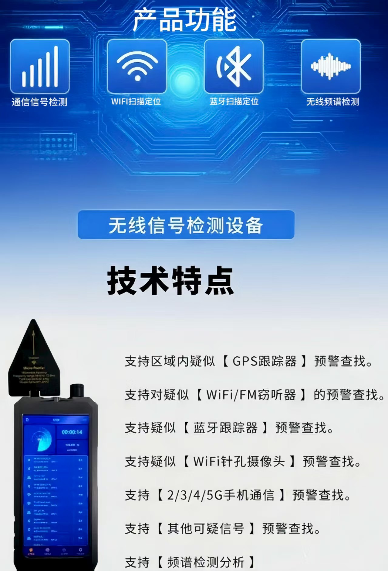 产品适用场景:军工、政企、公安技侦、特勤局、安全、纪委、保密会议室、商务洽谈室、领导办公室、银行金融、商旅酒店、及其他存在无线环境安全隐患等场景下的各种无线窃听器、窃视、wifi信号、无线信号、跟踪器的查找