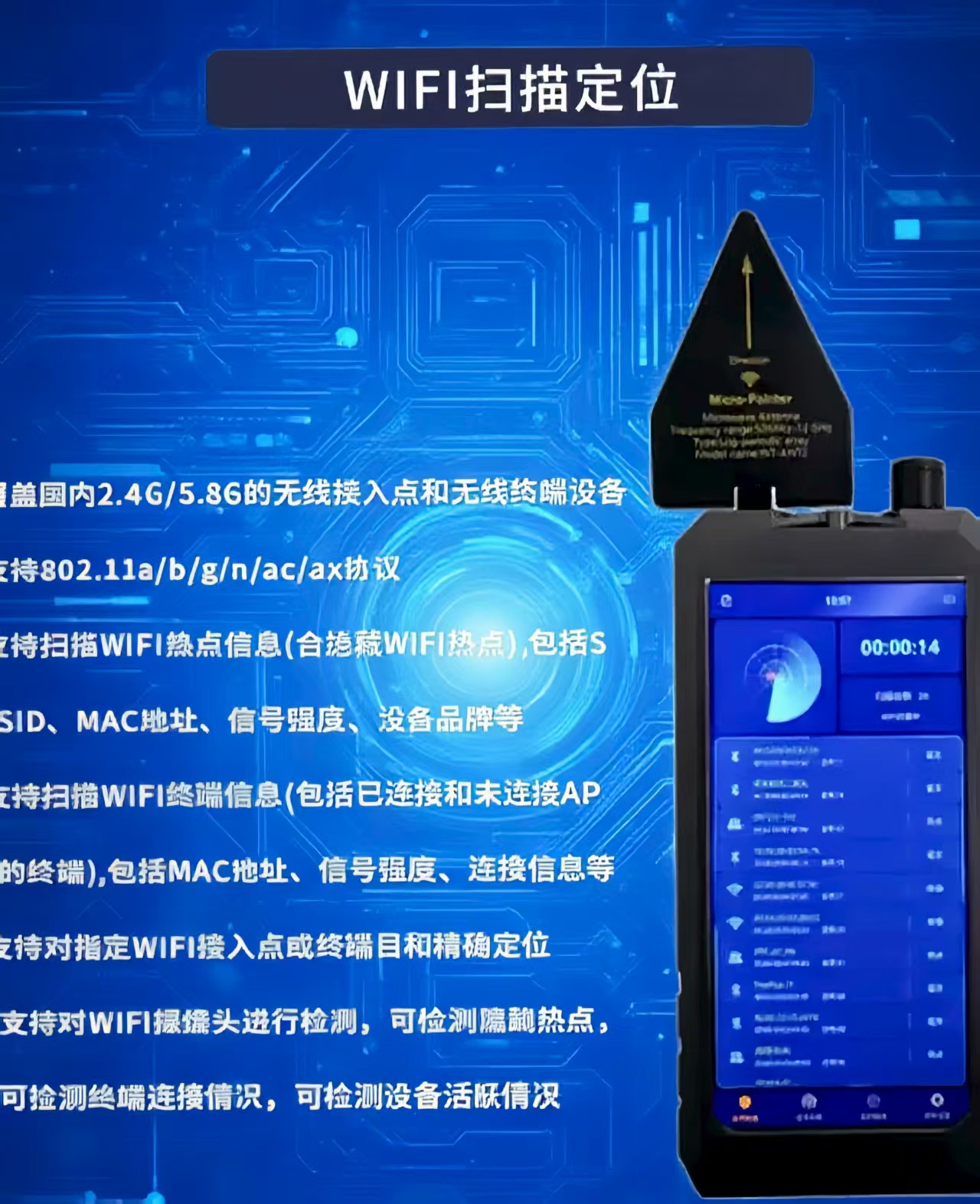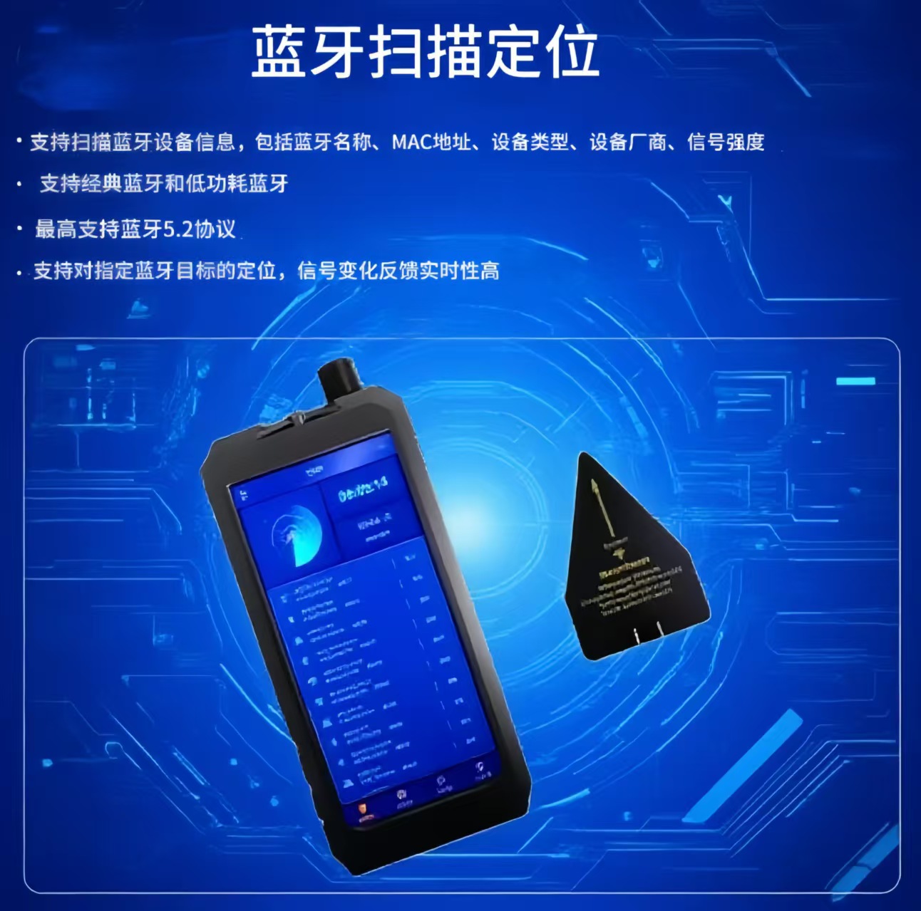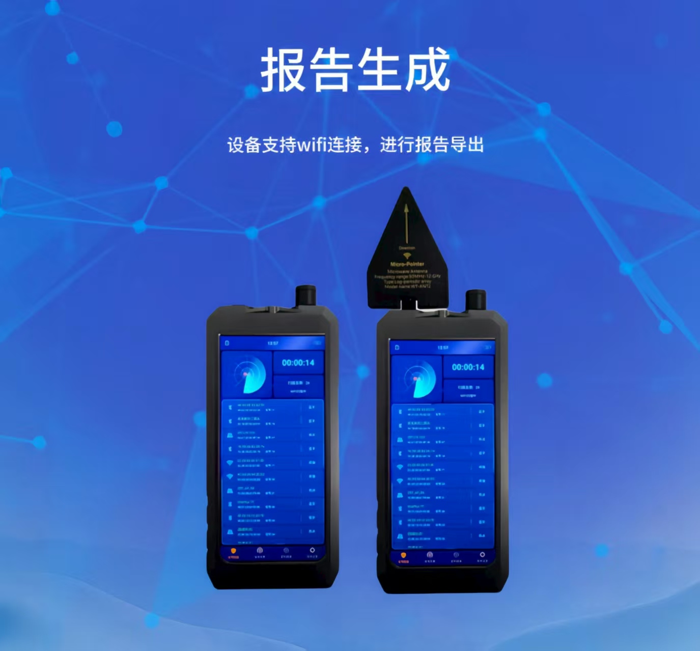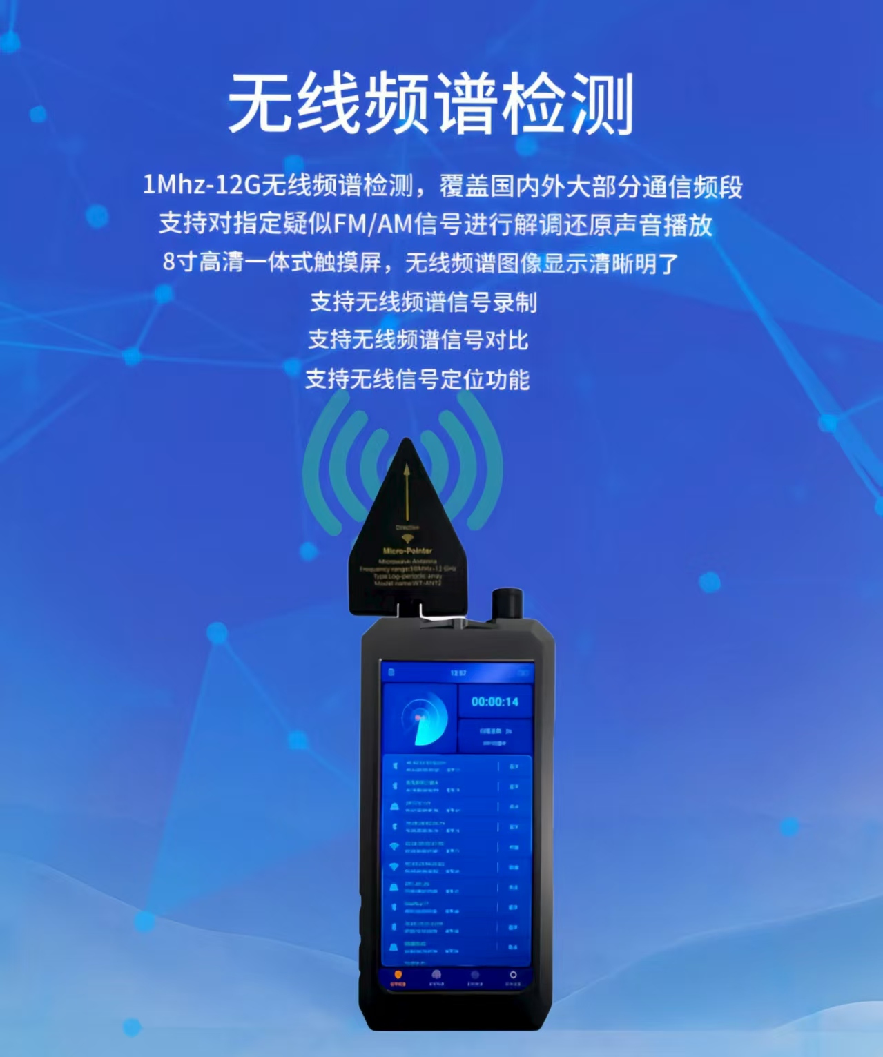 产品适用场景:军工、政企、公安技侦、特勤局、安全、纪委、保密会议室、商务洽谈室、领导办公室、银行金融、商旅酒店、及其他存在无线环境安全隐患等场景下的各种无线窃听器、窃视、wifi信号、无线信号、跟踪器的查找
