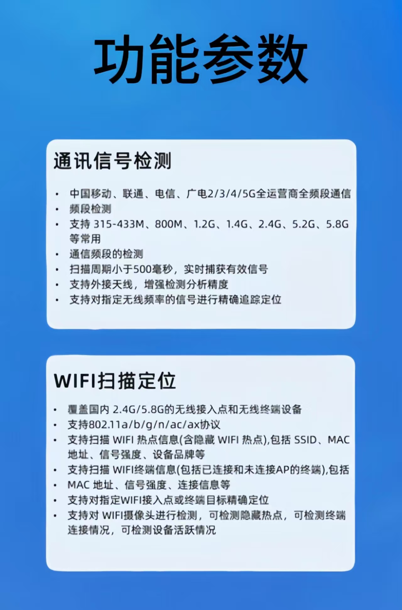 产品简介:实时检测区域内无线环境状况,尤其是GPS跟踪器、窃听器、蓝牙跟踪器、WiFi无线窃视摄像头等可疑信号的发现预警和精准位置确认,有效排除环境中的安全隐患