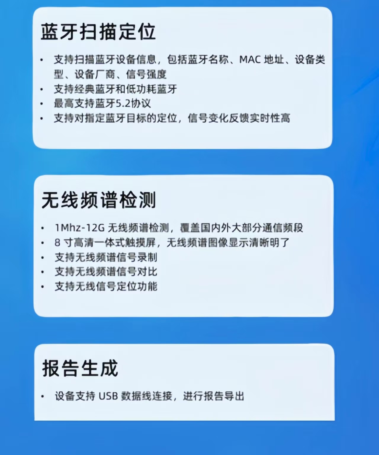 4.无线频谱检测 1Mhz-12G无线频谱,覆盖国内外大部分通信频段,支持对疑似【 FM窃听器 】的预警查找。